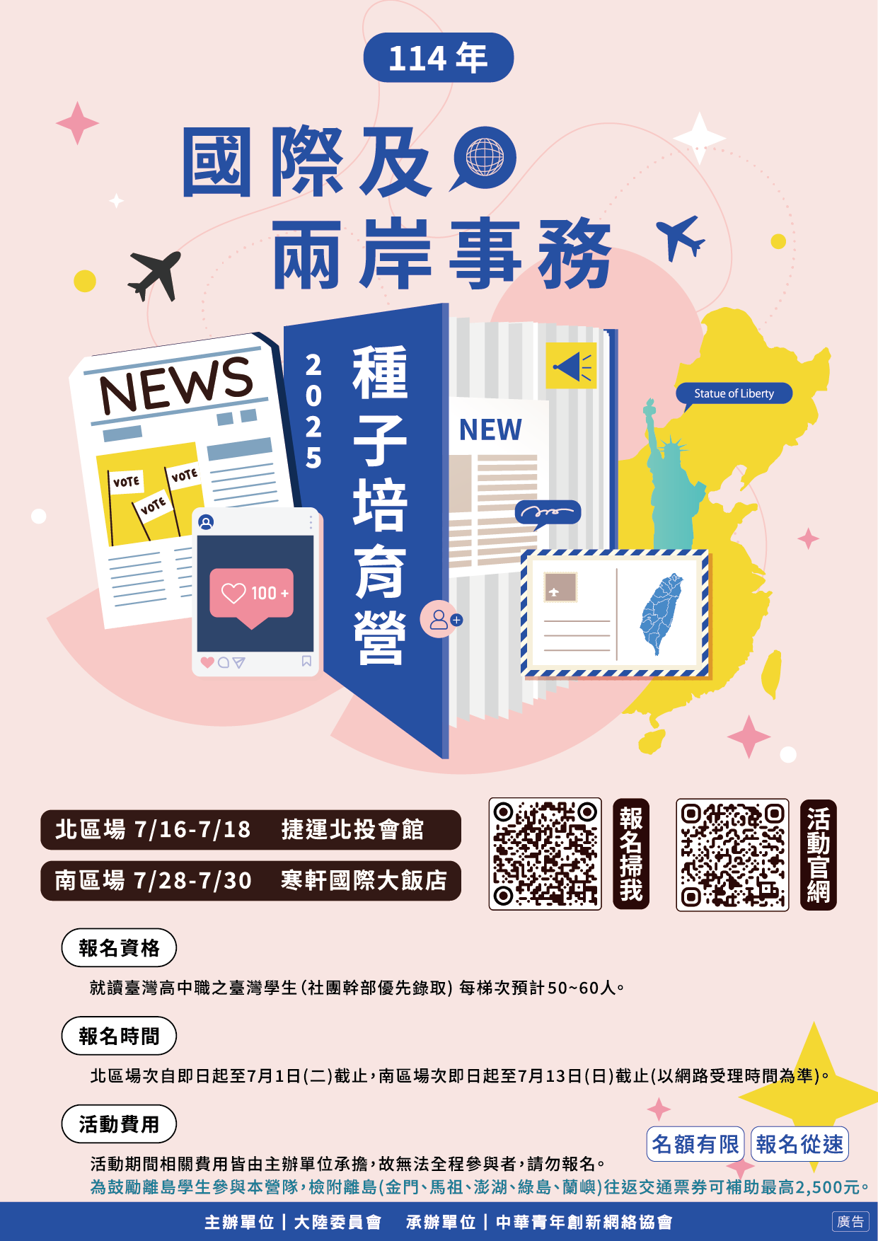 報名資格:就讀臺灣高中職之臺灣學生(社團幹部優先錄取),每場次保障單一性別人數至少3分之1,每梯次預計各50~60人。